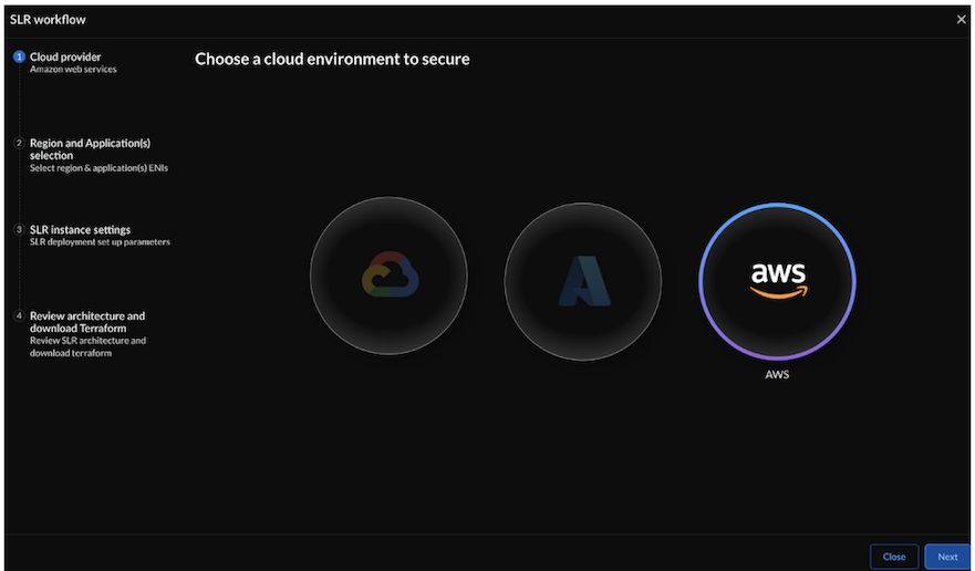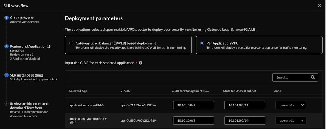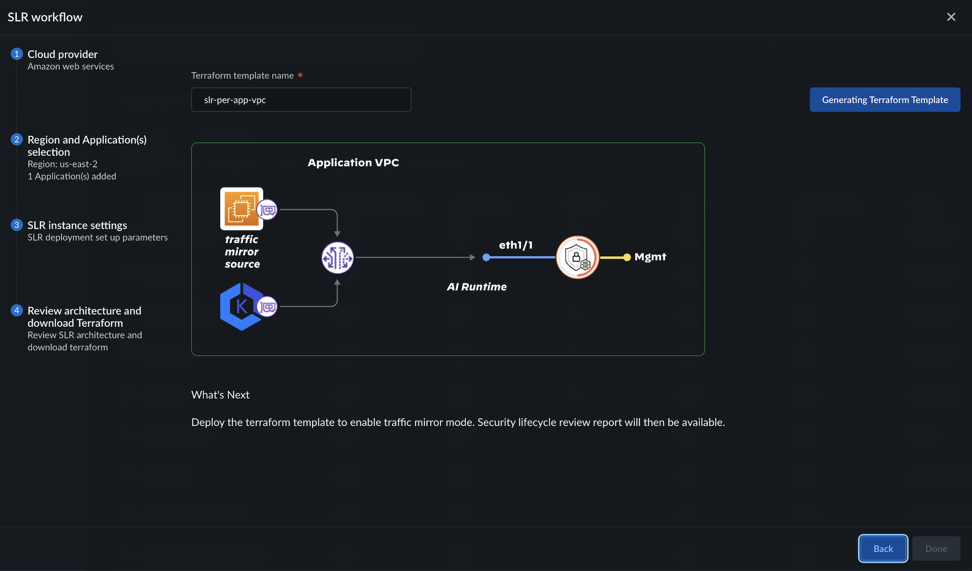Click Done.Initialize and apply the Terraform for the `security_project` to deploy a standalone SLR per VPC in traffic mirroring mode within the application VPC.The security Terraform for the security project creates the Gateway Load Balancer (GWLB) endpoints in your selected application VPC. It also deploys an Auto Scaling Group (ASG) with an SLR in a security VPC. The SLR receives the mirrored traffic from the application ENIs.cd architecture cd security_project terraform init terraform plan terraform applyTo ensure the Per App SLR management interface can connect to the internet through the Internet Gateway(IGW) to function properly in your security VPC, you must manually add the IGW to its route table.Configure IGW for SLR firewall management subnet:- Create an Internet Gateway (IGW) in your application VPC if you