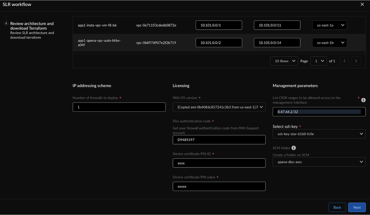 In Deployment Parameters, select Per Application VPC.Input the CIDR for each selected application:- Enter the CIDR IP address for the management port.