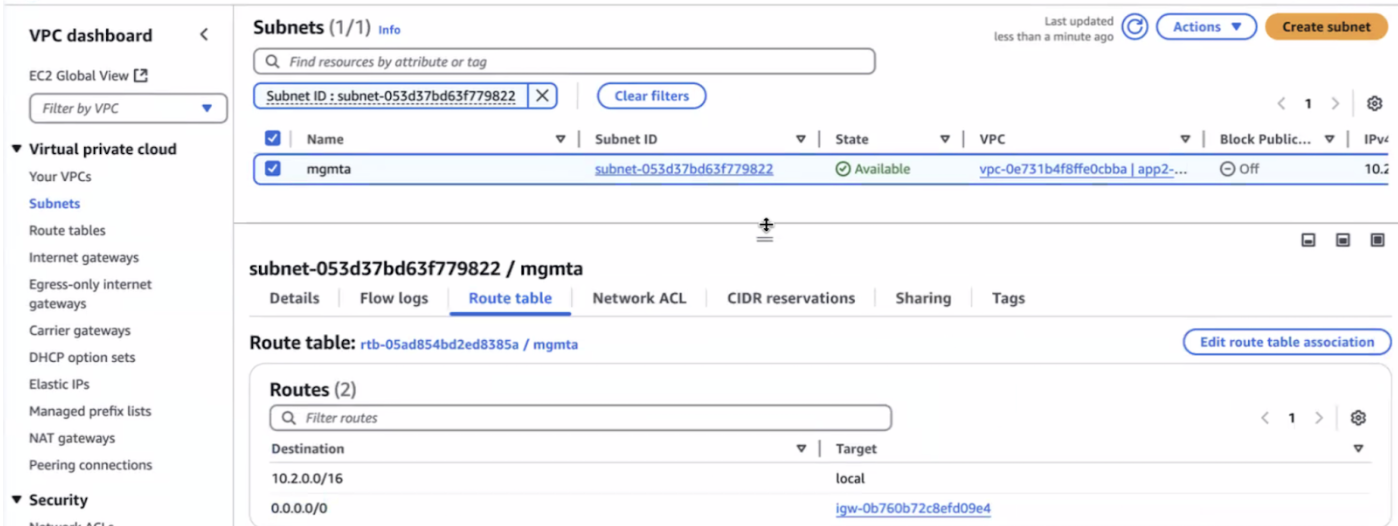 - In the subnet details, select the Route table tab.