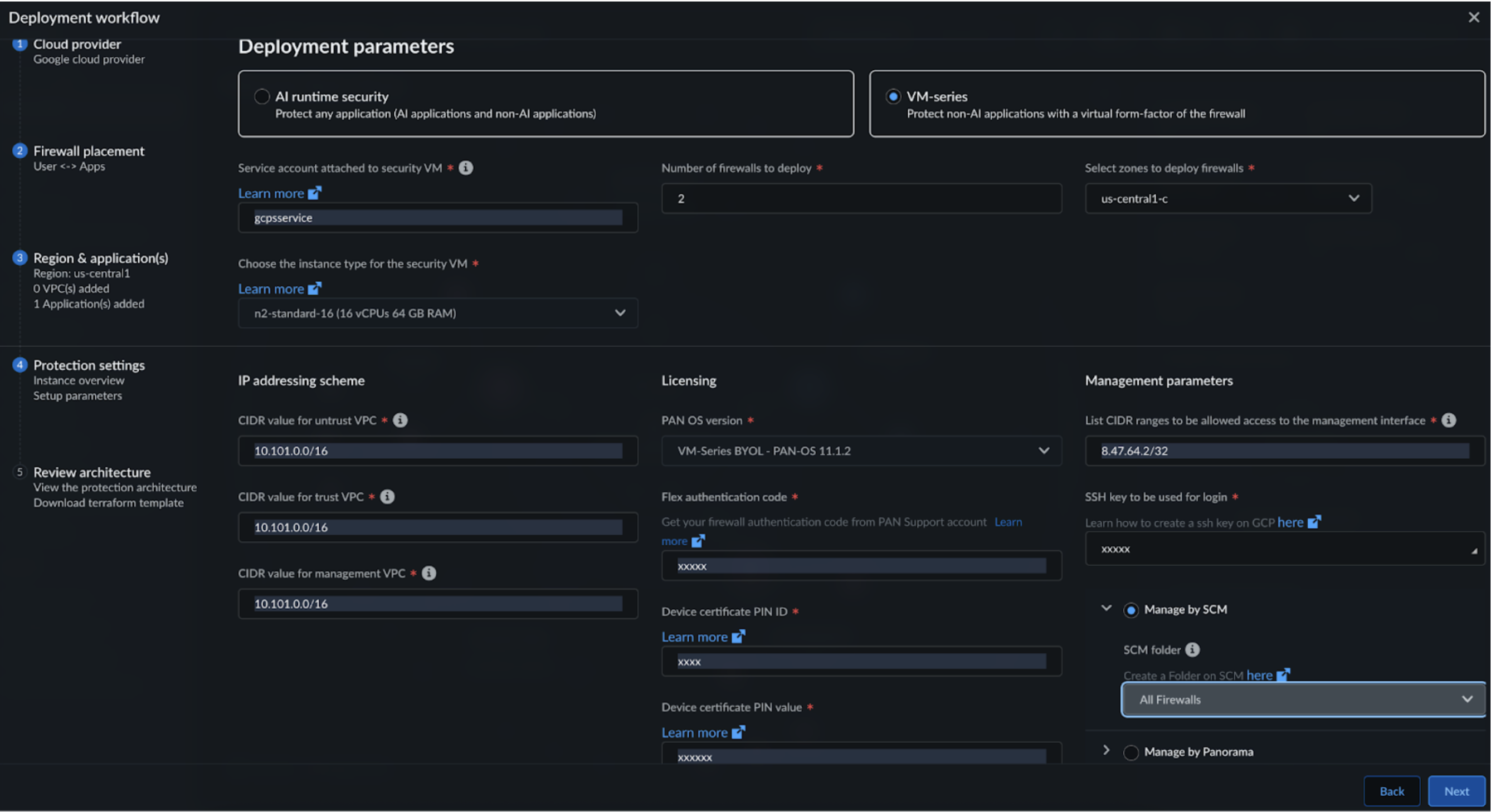 In this section, you will configure a VM-Series firewall in Strata Cloud Manager, download the corresponding Terraform template, and deploy it