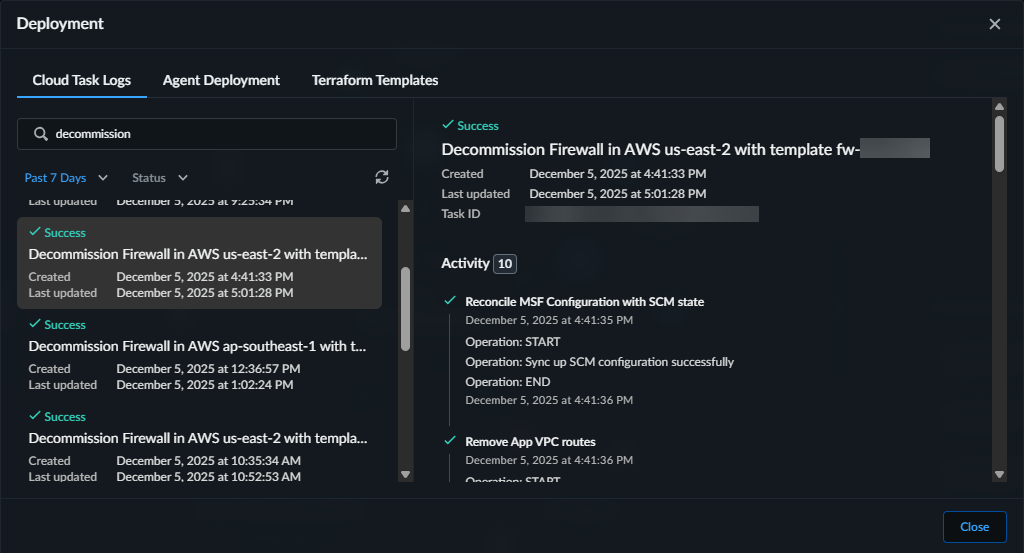 You might need to decommission some deployed firewalls and cloud resources as your network changes. To decommission a auto-executed firewall, delete a Terraform template of an auto-execute deployment, the associated firewalls, and any cloud resources deployed in your cloud environment. Additionally, this process releases the Software NGFW credits used to license the deployed firewalls. This process does not modify or delete your cloud account, so you can deploy more firewalls in that cloud account as needed.