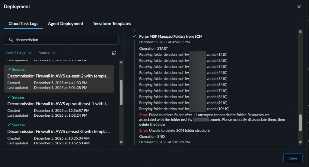 The Purge MSF Managed Folders from SCM activity within the Decommission task may currently log an error if other active firewall clusters exist in the same folder, but this error has no functional impact on the system.