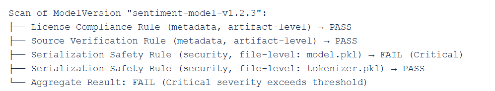 ScanWhen models are evaluated against these Rules, a Scan is performed, documenting the verdict across all rules. These Scans create an audit trail of security evaluations and serve as decision points to either promote secure models forward or block potentially threatening ones early in your workflow.