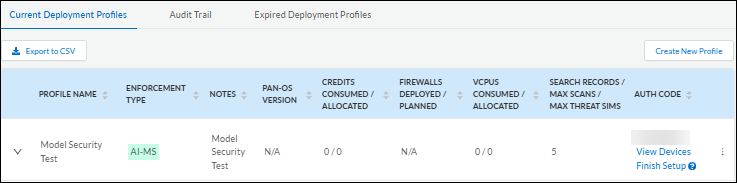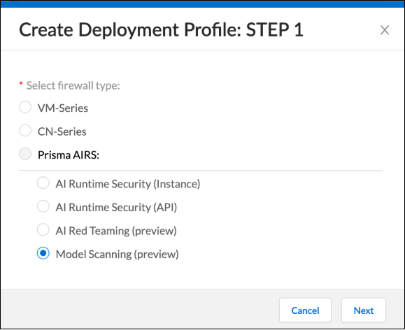 - Log in to the Palo Alto Customer Support Portal (CSP).Navigate to ProductsSoftware/Cloud NGFW Credits.Locate your credit pool and click Create Deployment Profile.Under Select firewall type, expand Prisma AIRS and select Model Scanning (preview).