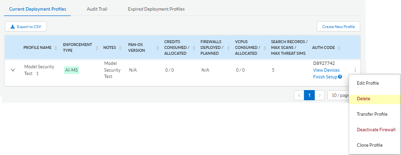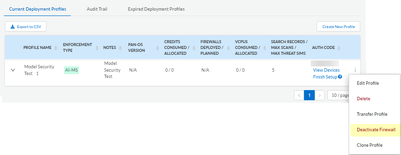 - Log in to the Palo Alto Customer Support Portal (CSP).In the CSP dashboard, click on the three dots (ellipsis or overflow menu) next to the deployment profile.If you have not yet deactivated the profile, select Deactivate Firewall.After you have successfully deactivated the profile, select Delete.