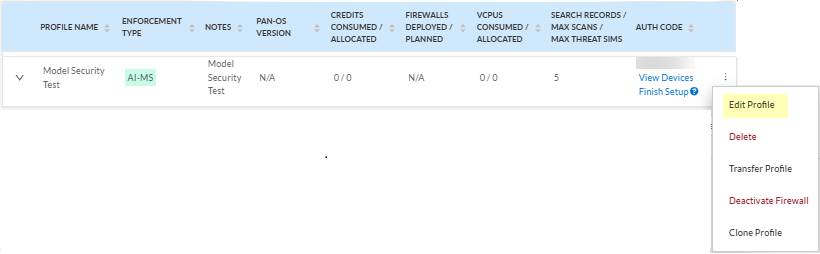You can edit an existing deployment profile on the CSP as long as AI Model Security supports your updates to the deployment profile. These changes may include changing the number of scans allocated per month.- Log in to the Palo Alto Customer Support Portal (CSP).In the CSP dashboard, click on the three dots (ellipsis or overflow menu) next to your deployment profile.