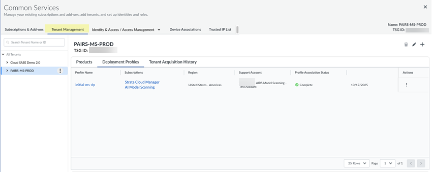Agree to the terms, then click Activate.Deployment Profile activation may take up to two hours. Once activated, the AI model Security will be visible in the Strata Cloud Manager web interface (InsightsPrisma AIRSModel Security).You're redirected to the Tenant Management page which shows the instances for the tenant.Verify the TSG association in the Hub. To do this:- Navigate to Common ServicesTenant Management.Select the tenant and switch to Deployment Profiles.Confirm that the Profile Association Status is Complete.