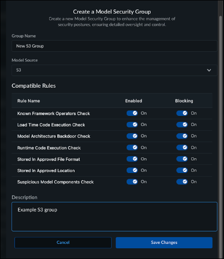 Enter the Group Name and select the Model Source type from the drop-down list. Optionally, configure the security rules that appear and add a description.(Optional) Configure the compatible security rules by enabling or blocking the rule.Add a Description for the Model Security Group.