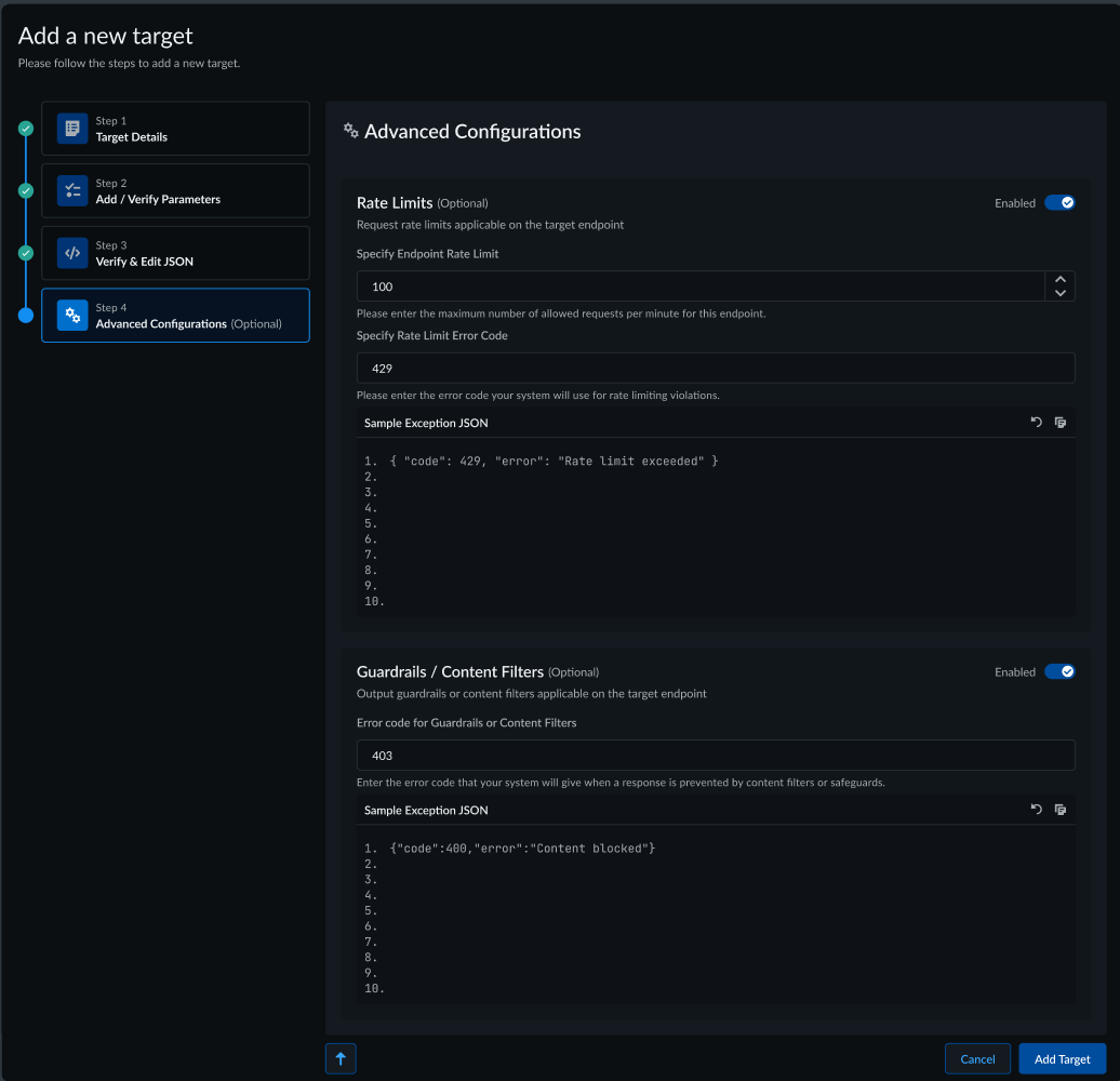 Enable Rate Limits for applications on the target endpoint.- Specify the Endpoint Rate Limit. This value represents the maximum number of allowed requests per minute for the specified endpoint.Specify the Endpoint Rate Limit Error Code. This field represents the error code your system uses for rate limiting violations.Provide a Sample Exception JSON.Enable Guardrails/Content Filters. These fields are used for output guardrails or content filters applicable on the target endpoint.