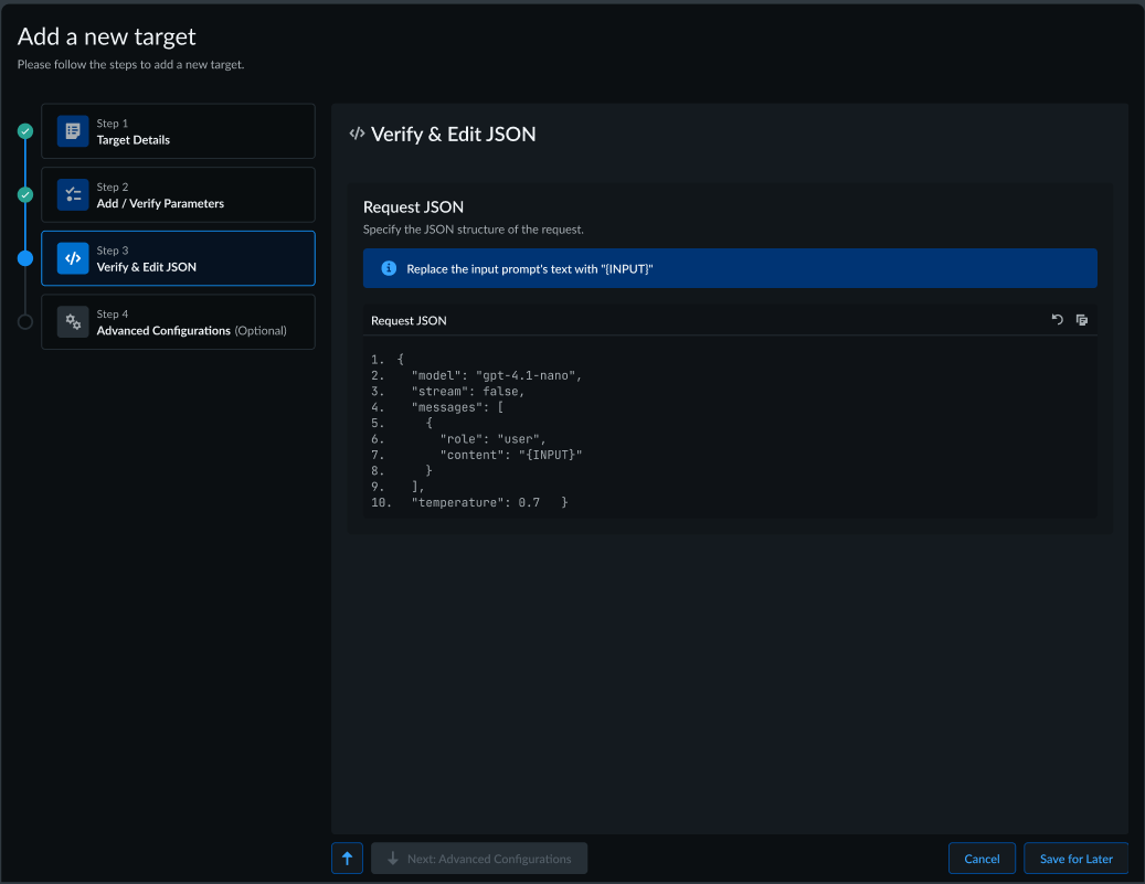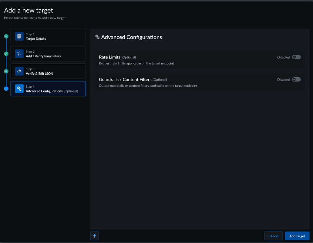 Click Next: Advanced Configurations.In the Advanced Configurations page you'll configure Rate Limits and set Guardrails/Content Filters.
