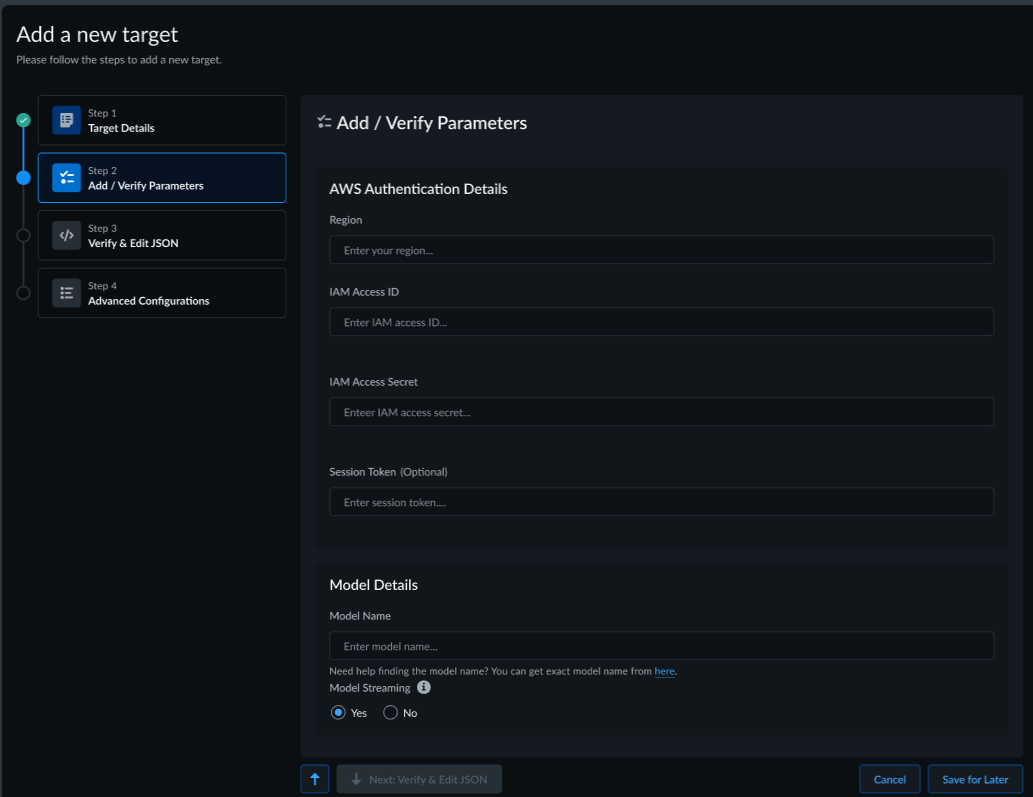 - Specify the Region.Enter the IAM Access ID.Enter the IAM Access Secret.Optionally enter the Session Token.In the Model Details section: