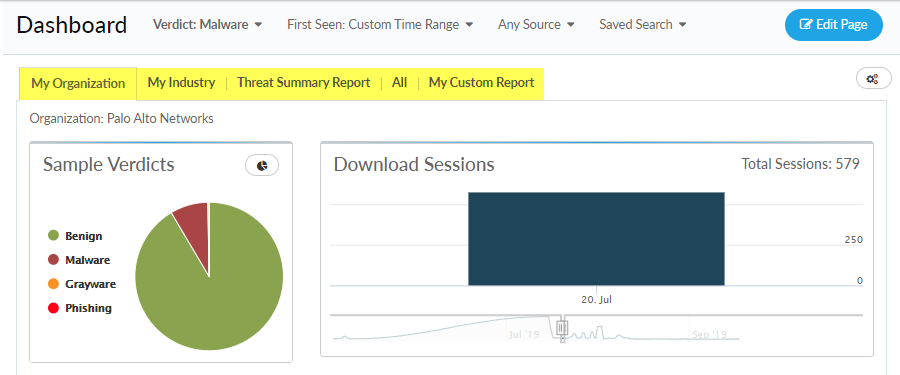 - All—View the global threat landscape to contextualize both threats affecting your network and your industry. The All tab includes the additional widget Target Industries that allows you to compare malware rates across industries.The Industry and All views display statistics for all samples (public and private) but do not allow access to the details of private samples (unless they are private samples from firewalls associated with your support account).