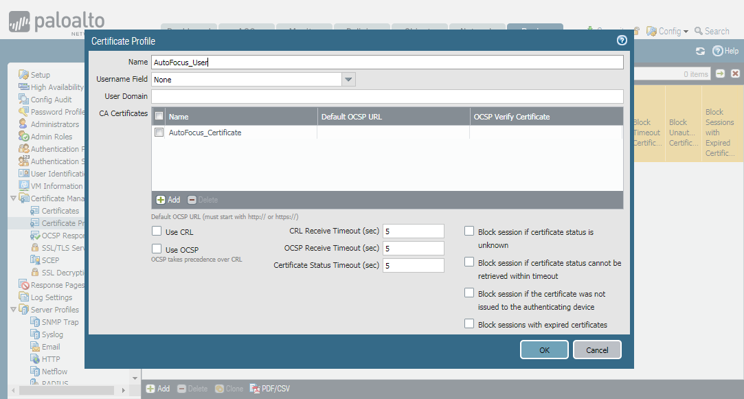 - Select the Certificate Profile you created for the AutoFocus PEM certificate.