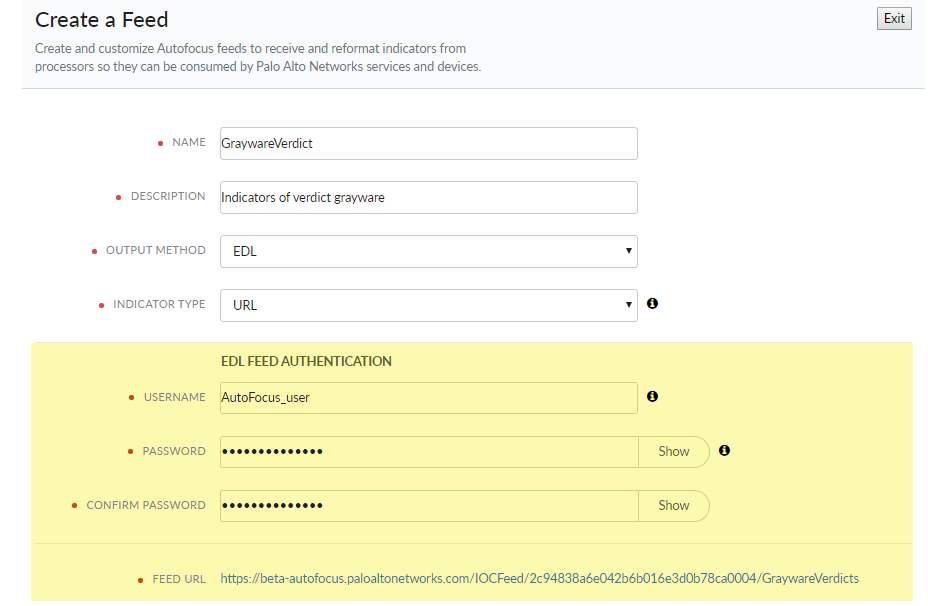 - Add the AutoFocus-generated feed link as the Source of the external dynamic list. To find this link in AutoFocus, edit the EDL custom feed you want to receive updates from. The feed link is located at the bottom of the page, which also includes the custom feed details and configuration.