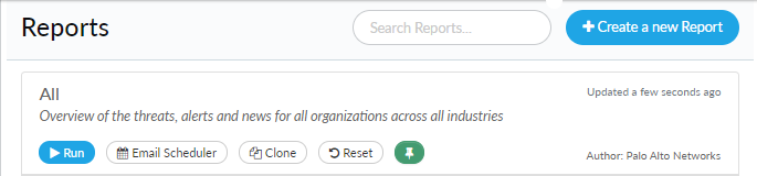 - New Report based on an existing report—Click Clone to create and open a duplicate of the selected report. A new report based on an existing one opens in editing mode. If you do not provide a new name for the report, AutoFocus creates a name by appending the name on which the report is based with the word clone. For example, Custom Report 1 Clone.
