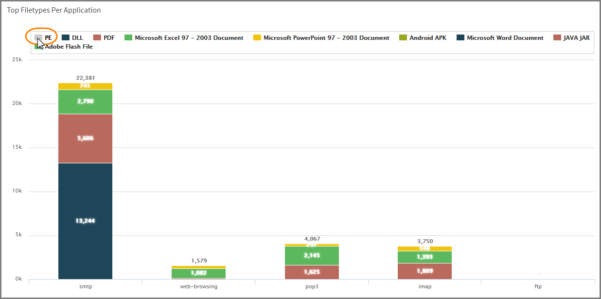 4. For the charts Malware Session Percentage By Day and Top Filetypes Per Application, select which data to display or hide.
