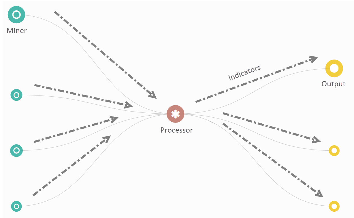 - Processors receive indicators from miners and can aggregate indicators, eliminate duplicated indicators, and merge different sets of metadata for the same indicator. For example, a common type of processor is one that receives only IPv4 indicators.