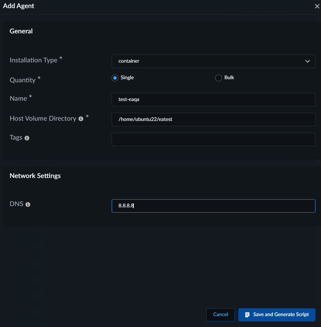 On the General tab, select Installation Type as Container and Quantity as Single for single agent deployment or Bulk for multiple agents.Provide required identification and configuration details based on your selection:- If Single is selected: Enter a unique Agent Name.