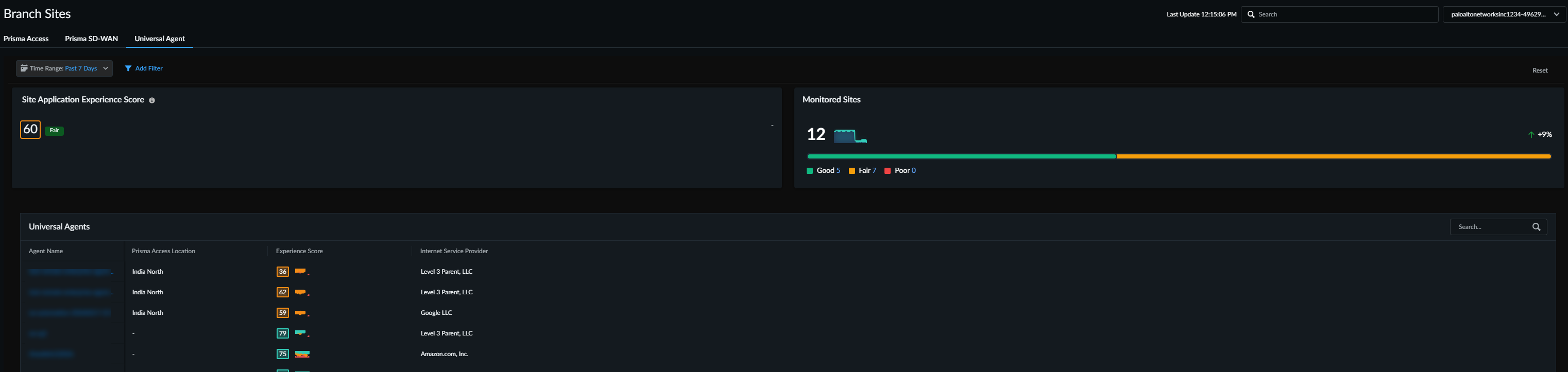 - Select InsightsBranch SitesUniversal Agent tab.Review the aggregated Site Application Experience Score and the number of Monitored Sites, which provides a high-level overview of overall agent performance.