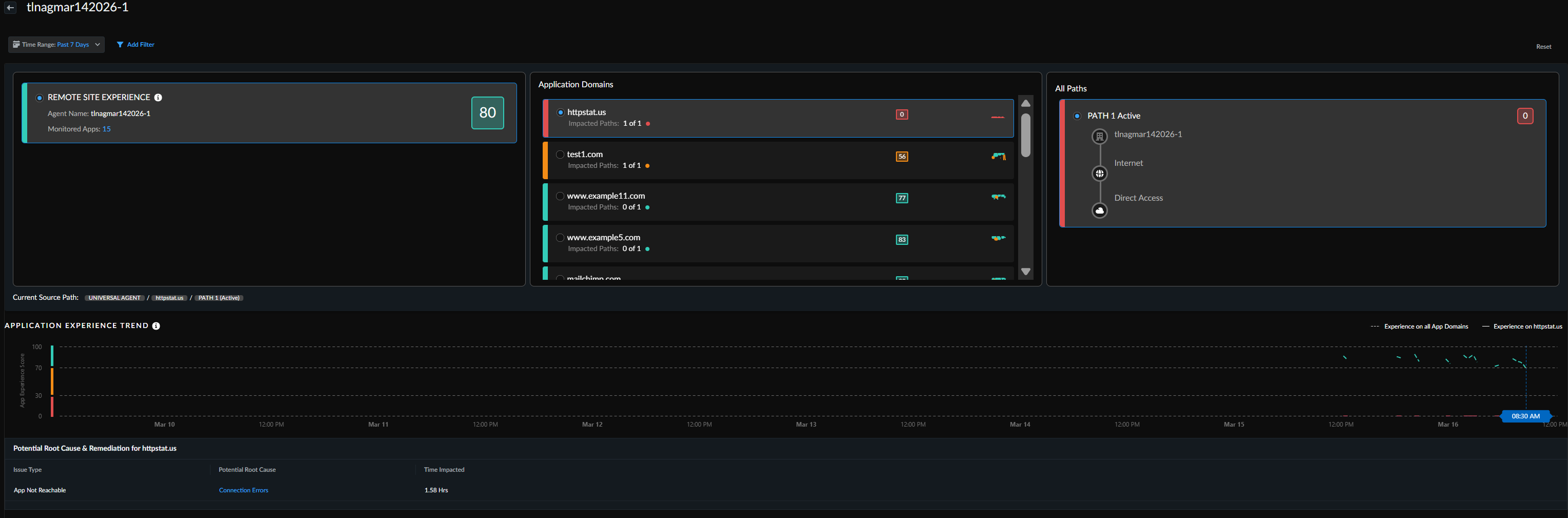 For segment-wise impact analysis, select InsightsApplication ExperienceSegment-Wise Remote Site Impact.Observe the topology diagram showing the path from Universal AgentNetwork NodeWAN PathDatacenterMonitored Apps. This view is also present in the App Suite View and per Domain view, providing a clear visual representation of traffic flow and potential choke points.