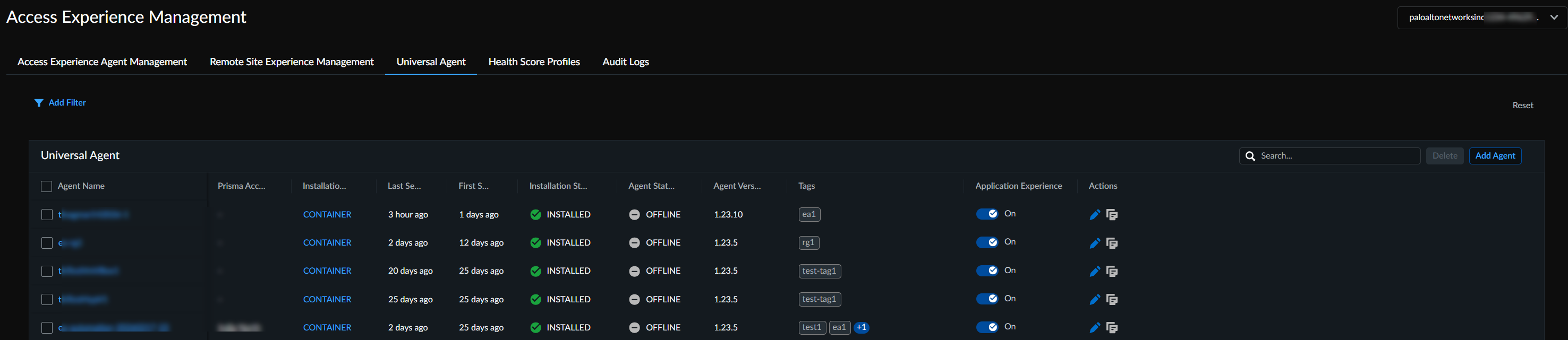 Specify the Host Volume Directory path where you want to store your agent files. Optionally, you can add Tags to help you search for and identify this agent later.Deploy the Universal Agent.Execute the copied script in your container management platform (for example, a Linux terminal). The script pulls the container image from the Palo Alto Networks® image repository and deploys the agent, including a bootstrap token for initial registration.Verify Agent Registration.Select Access Experience ManagementUniversal Agent. Review the list of agents to confirm the new agent(s) are registered and show an Active status. Observe their assigned Agent Name, Location, and Experience Score.Monitor the performance and health of Universal Agent.- Select an active agent from the list (for example, TlnTest-6-1) to view its detailed monitoring dashboard, which provides a comprehensive overview of its performance and health: