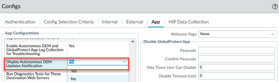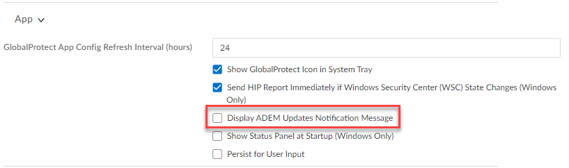 Starting in GlobalProtect version 5.2.8, you have the option to suppress receiving all Autonomous DEM update notifications (pertaining to installing,