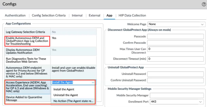 To enable Autonomous Digital Experience Management (ADEM) for your mobile users, you must enable ADEM in the GlobalProtect app settings. After you enable ADEM for a user, the GlobalProtect portal will automatically push
