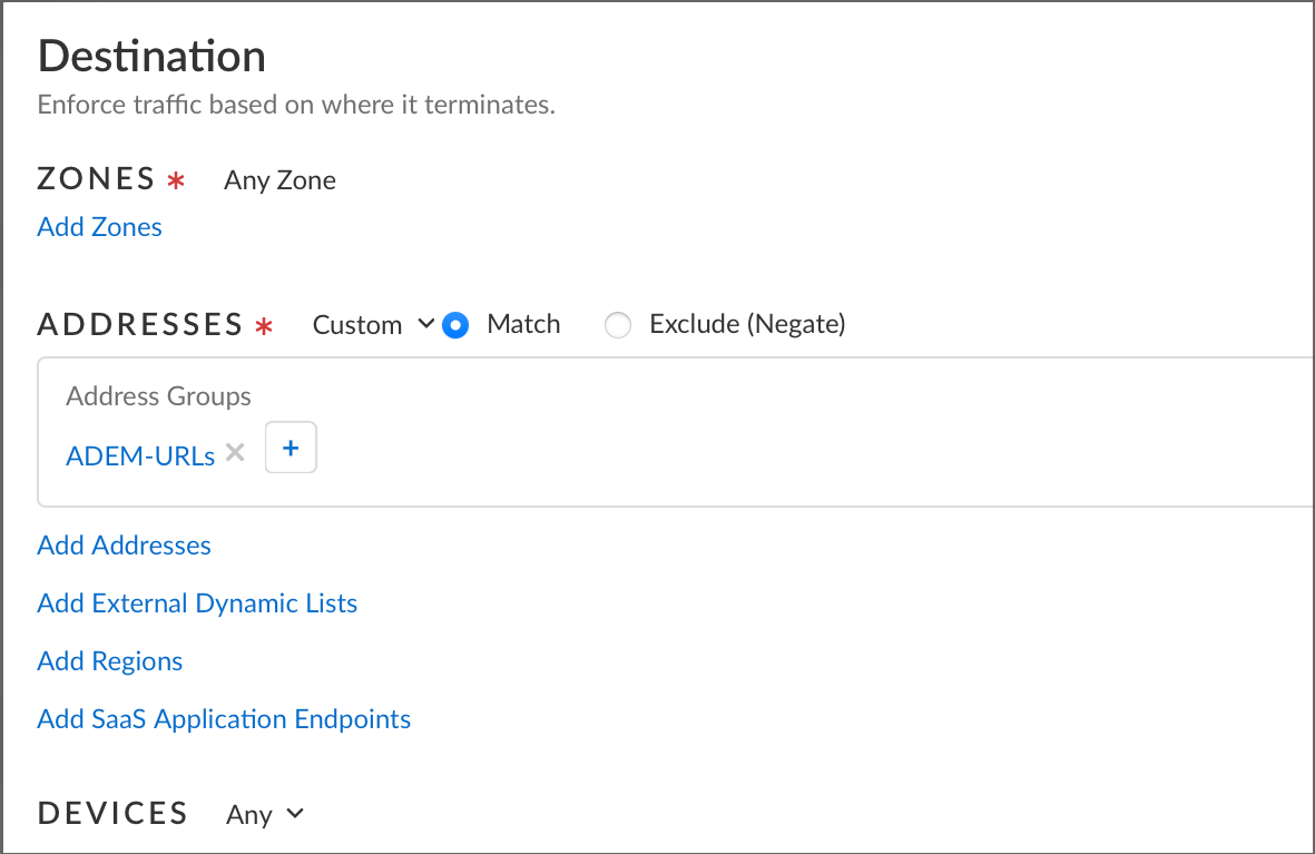 Create an Address Group with required ADEM URLs. Navigate