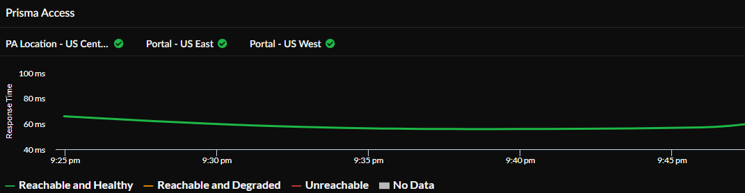 Prisma Access shows the available Prisma Access Locations. The one used in the query has a green checkmark next to it, showing that it is Reachable and Healthy.