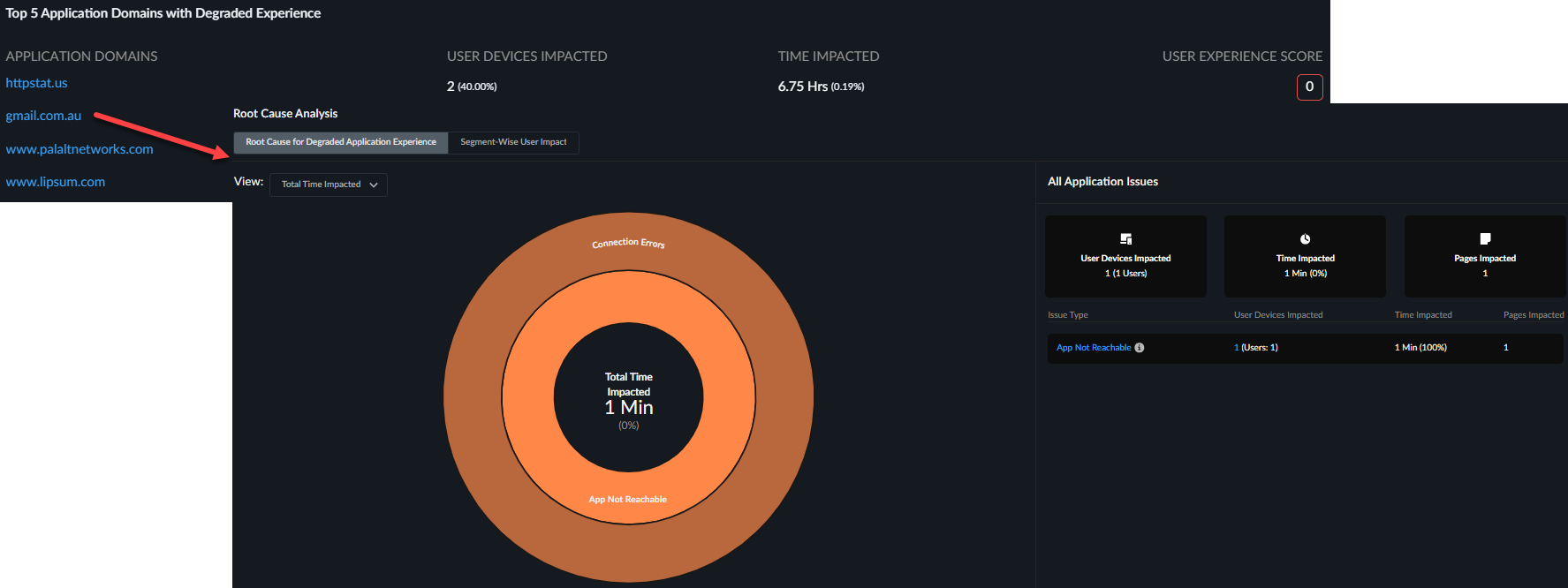 The Root Cause Analysis section shows details same as the those on Your Organization, except that the Application Issues table lists the count of individual application pages affected by specific issue type. To view the root cause analysis of an application, navigate to Insights > Application Experience and click an application domain name from the Top 5 Application Domains with Degraded Experience table