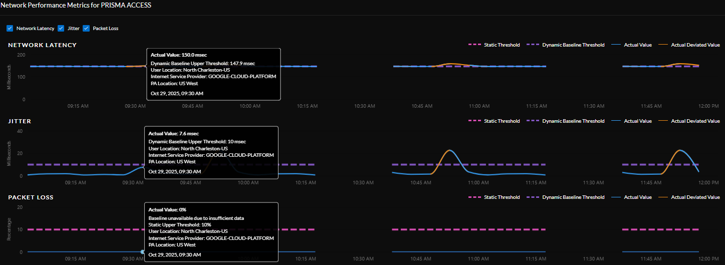 Hover over any point on the chart to view specific details such as actual value, the dynamic baseline band, user location, ISP, and Prisma Access Gateway location.