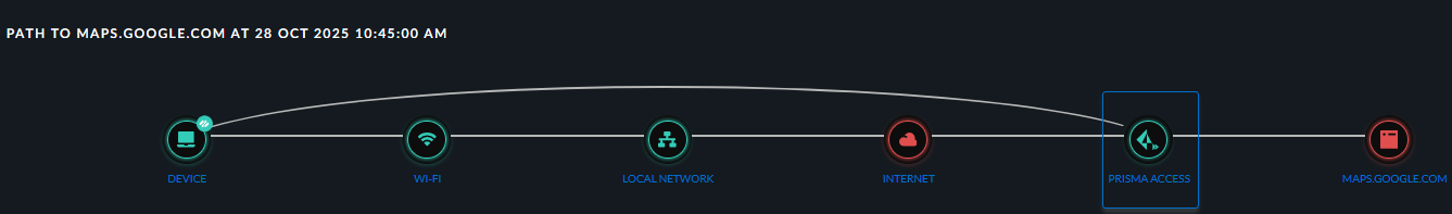 The Path to Domain shows the network segments through which the user’s traffic traveled to the app. The segment wise experience score for a segment determines its color. The network segments include device, Wi-Fi, LAN, ISP, and Prisma Access/NGFW gateway. If only RUM data is available, the only segments displayed are Device and App.