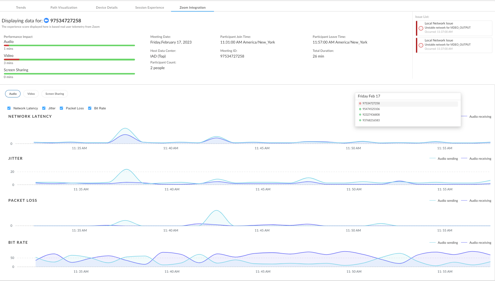 and Screen Sharing minutes. It shows you the network performance metrics for each of the