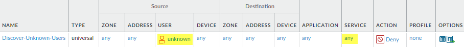 This rule identifies gaps in User-ID coverage by finding unknown users. It also identifies compromised or embedded devices in the user community that are trying to access your data center. (Embedded devices have no user interface, for example, printers, card readers, and cameras, but adversaries can compromise these devices and use them in an attack.)