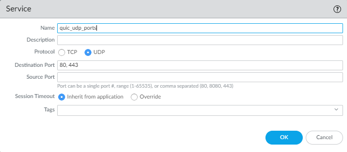 Create a Security policy rule to block QUIC on its UDP service ports (80 and 443) and create a separate rule to block the QUIC application. For the rule that blocks UDP ports 80 and 443, create a Service (ObjectsServices) that includes UDP ports 80 and 443: