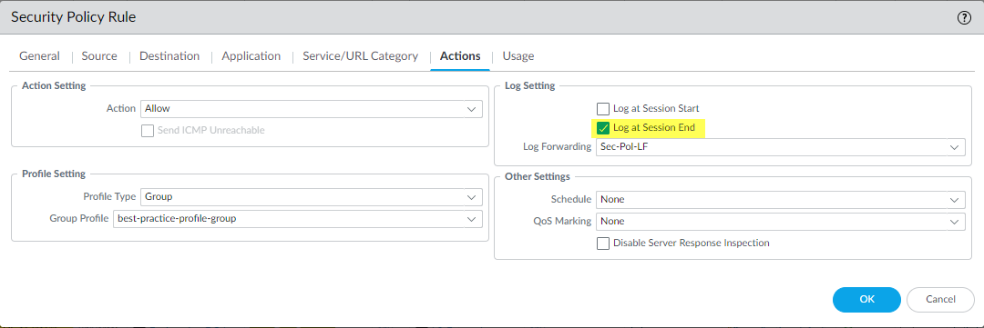 The best practice for most traffic is to Log at Session