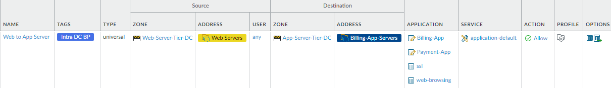 This example configures rules that allow traffic between application server tiers for two proprietary internal finance applications for which we created custom applications: Billing-App and Payment-App.