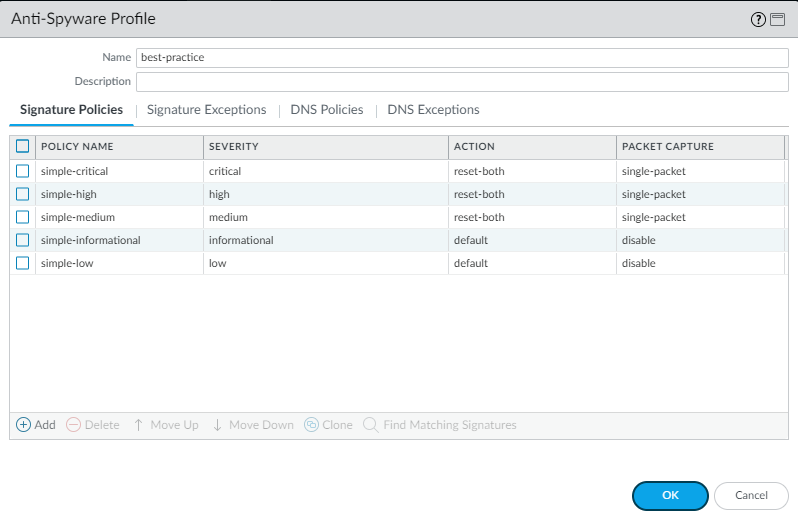 best practice Anti-Spyware profile to all security policy rules