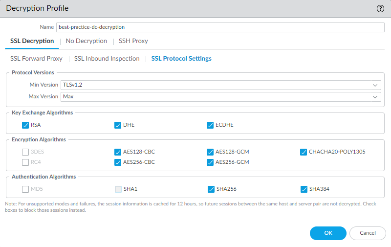 algorithms such as MD5 and SHA1.SSL Protocol Settings apply to all decrypted traffic.
