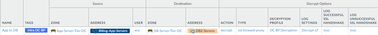 • This rule decrypts the traffic flowing between the application server tier and the database server tier for the Finance department’s billing servers.