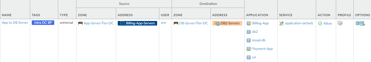 This example configures rules that allow traffic between application server tiers for two proprietary internal finance applications for which we created custom applications: Billing-App and Payment-App.