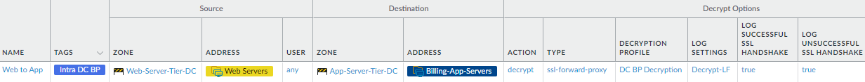 • This rule decrypts traffic flowing between the web server tier and the application server tier for the Finance department’s billing servers.
