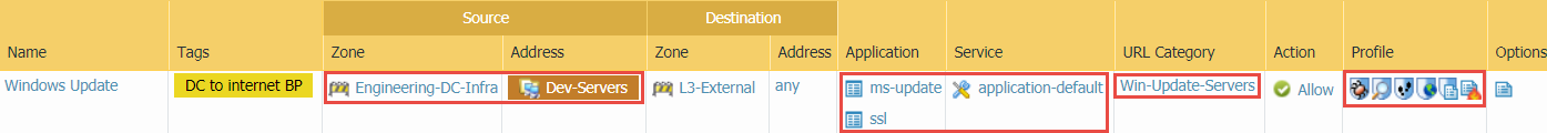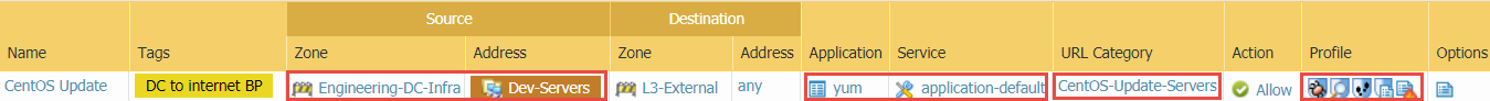 To create this rule:- Restrict the source of CentOS update requests to only the data center servers that need to retrieve updates, in this example the Dev-Servers dynamic address group in the Engineering-DC-Infra zone.