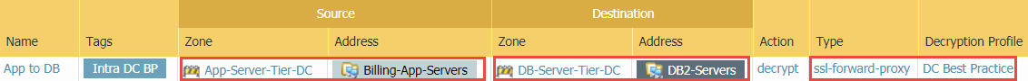 - This rule decrypts the traffic flowing between the application server tier and the database server tier for the Finance department’s billing servers.