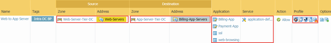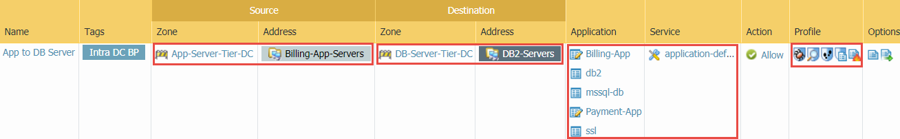 servers that may be compromised.A common application architecture consists of three server tiers: web servers, application servers, and database servers. Apply best practice Security profiles to most traffic between server tiers to prevent threats. Don’t apply Security profiles to low-value, high-volume traffic such as mailbox replication and backup flows—the firewall already inspected the original flows, so spending CPU cycles on them provides no extra value. Do create allow access rules for these applications to prevent misuse. For each rule, configure Log at Session End on the Actions tab and set up Log Forwarding to track and analyze rule violations.This example configures rules that allow traffic between application server tiers for two proprietary internal finance applications for which we created custom applications: Billing-App and Payment-App.