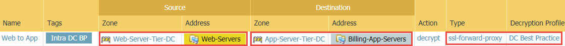 - This rule decrypts traffic flowing between the web server tier and the application server tier for the Finance department’s billing servers.