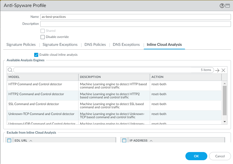 For Inline Cloud Analysis (requires Advanced Threat Prevention subscription), Enable cloud inline analysis on all outbound traffic. Set the Action to reset-both for all models.