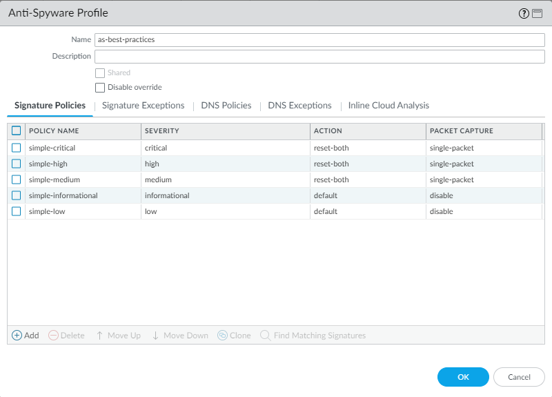 Use these Anti-Spyware security profile settings as a best practice at your internet gateway.
