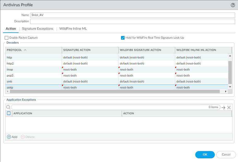 Set WildFire Signature and WildFire Inline ML actions for all seven protocols (the Antivirus profile also enforces actions based on WildFire signatures) and if you haven't already done it, enable real-time signature lookup as shown in Transition Antivirus Profiles Safely to Best Practices.