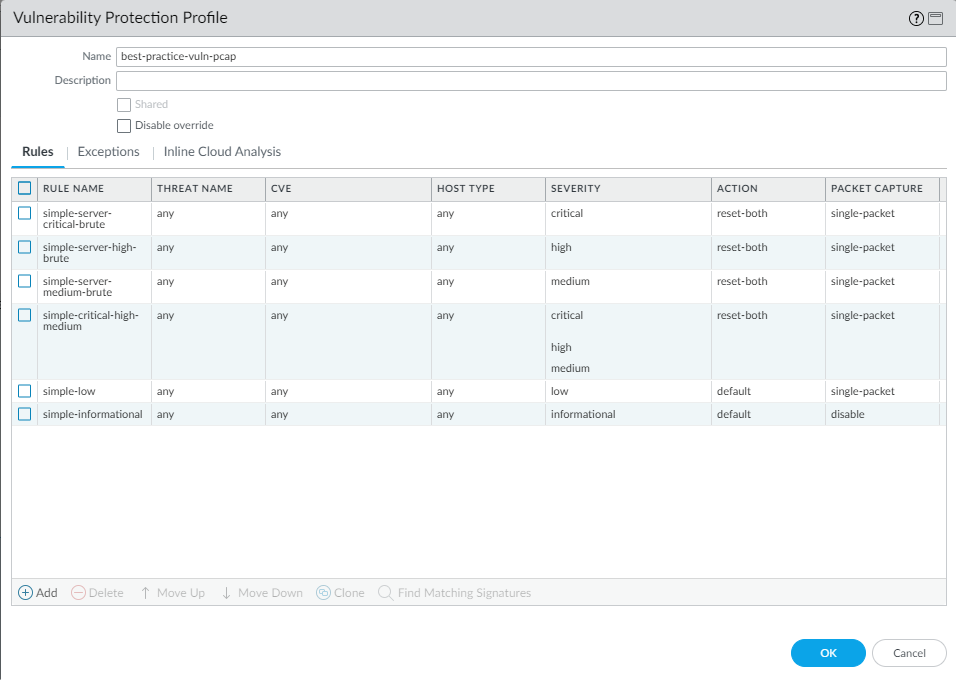 Attach a Vulnerability Protection profile to all allowed traffic to protect against buffer overflows, illegal code execution, and other attempts to exploit client- and server-side vulnerabilities. To ensure availability for business-critical applications, follow the Transition Vulnerability Protection Profiles Safely to Best Practices advice as you move from your current state to the best practice profile. Clone the predefined strict Vulnerability Protection profile and edit it to create the best practice profile: